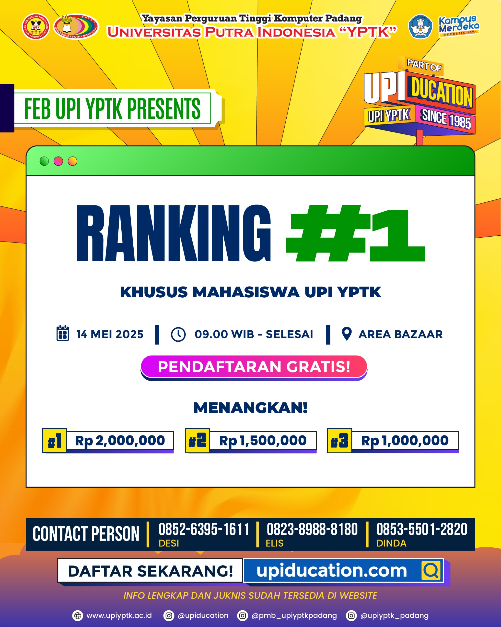 Kembali ke homepage Lomba Rangking 1Kategori Mahasiswa UPI YPTK DOWNLOAD/ SHARE JUKNIS FEB - LOMBA RANKING 1 Contact Person :0852 6395 1611 (Desi) 0823 8988 8180 (Elis) 0853 5501 2820 (Dinda) DAFTAR SEKARANG